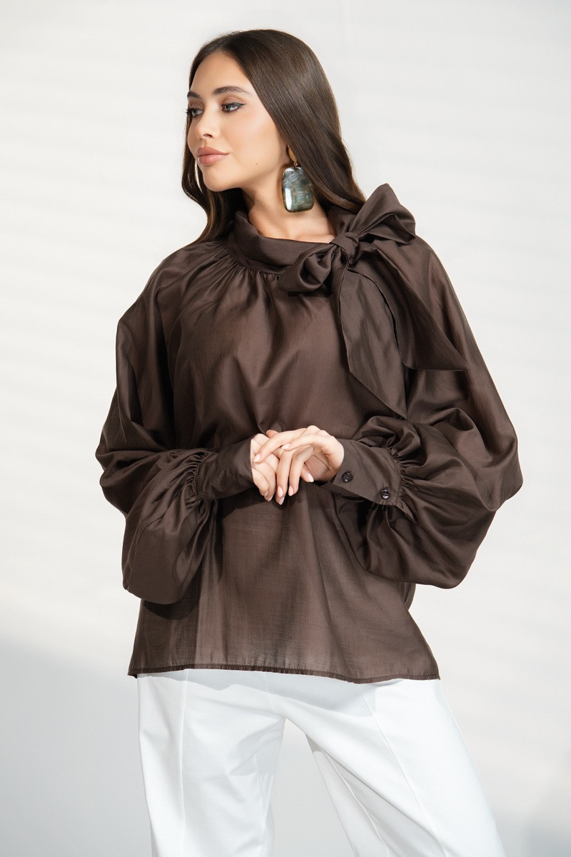 Елегантен дамски топ с ефирна материя и изразителен дизайн. Моделът се отличава с обемни ръкави и декоративна панделка при деколтето, които придават стилен и женствен акцент. Свободната кройка създава комфорт и лекота при носене, а тъмнокафявият цвят добавя изискано и модерно излъчване. Подходящ е както за елегантни комбинации с панталон или пола, така и за стилна вечерна визия.