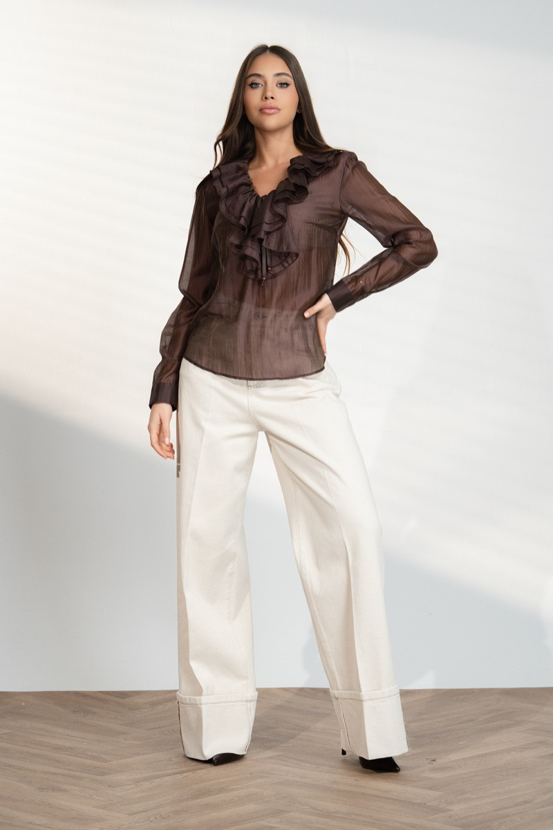 Нежна и стилна дамска риза в наситен кафяв цвят, изработена от лека и ефирна материя. Моделът впечатлява с красиви волани около деколтето, които придават романтично и елегантно излъчване. Фината прозрачност и изчистената линия създават женствена визия, подходяща както за ежедневието, така и за по-специални поводи. Ризата се съчетава лесно с панталони или поли и добавя изискан акцент към всяка визия. ✨