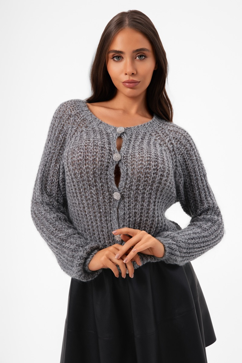 Закопчава се с декоративни копчета с кристални акценти, добавящи изтънчен блясък и луксозен завършек. Идеална както за ежедневието, така и за вечерни комбинации с пола или дънки.