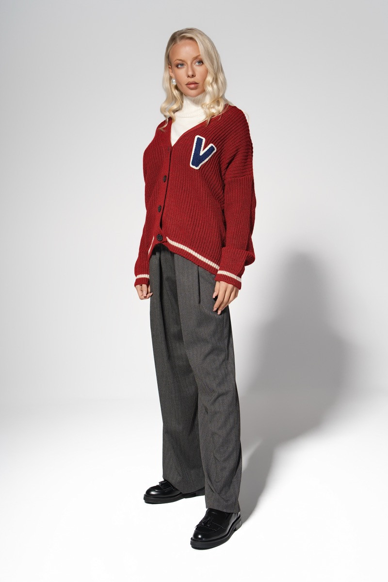 Мека и топла плетена жилетка в наситено винено червено, вдъхновена от колежанския стил. Моделът е със свободна кройка, едро плетиво и контрастни детайли в бяло по подгъва и ръкавите. На предната част е поставена апликация „V“, която придава модерен и характерен акцент. Идеална за ежедневни визии, layering и уютни есенно-зимни комбинации.